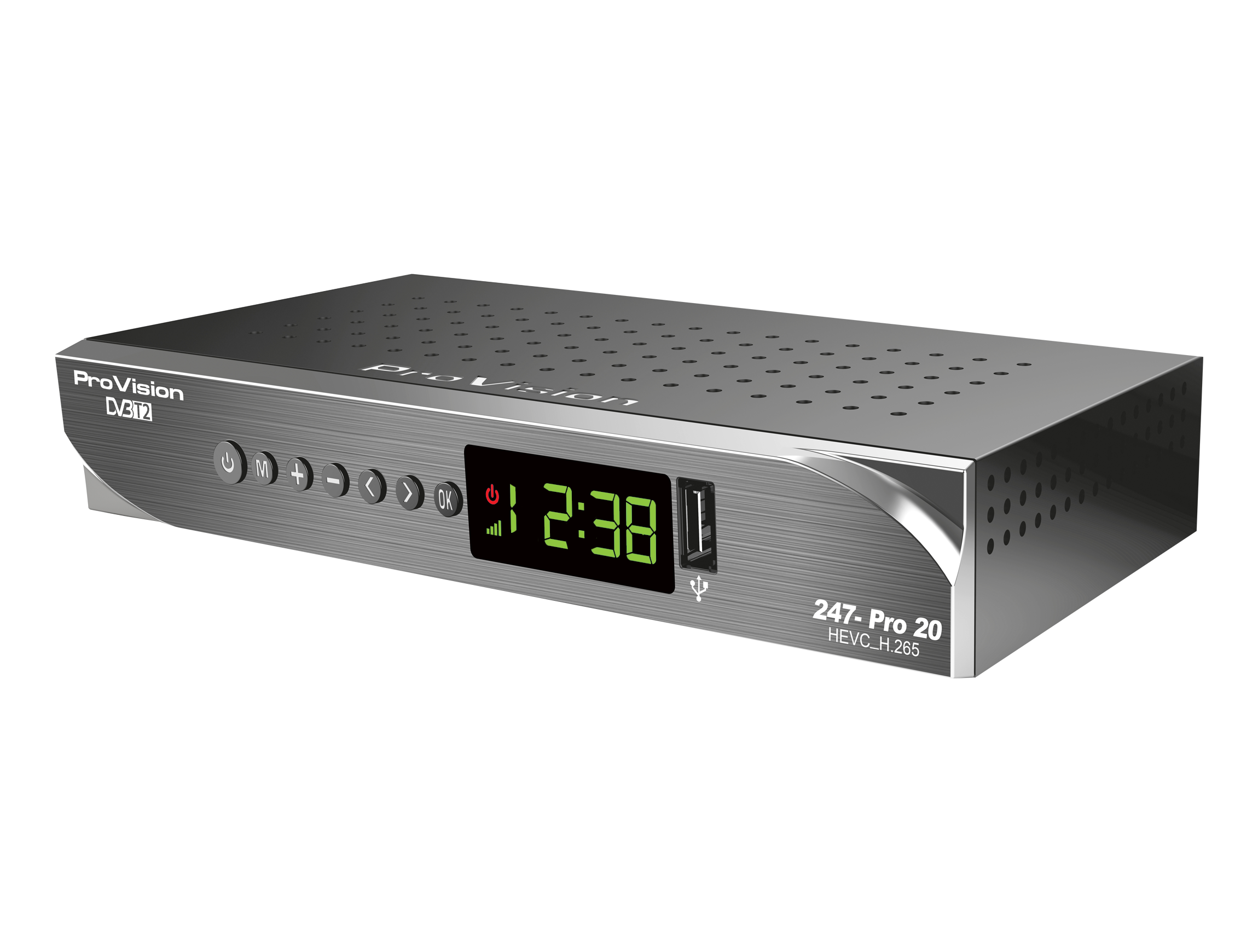 مدل 247 پرو 20 از جدیدترین دستگاه های گیرنده دیجیتالHEVC ده بیت خانگی برند پروویژن است. پنل جلوی آن دارای 7 دکمه و یک پورت USB است. از ویژگی های برجسته آن می توان به قدرت گیرندگی بسیار بالا اشاره نمود.